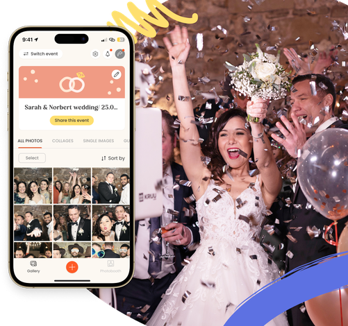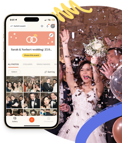 I tuoi ospiti possono partecipare prima dell'evento utilizzando il codice evento presente nell'app. Il giorno dell'evento potranno caricare le proprie foto, accedere alle foto caricate in precedenza e interagire con esse. Puoi trovare facilmente il codice nell'app e condividerlo via e-mail, SMS o social media. Quindi tutti sono coinvolti fin dall'inizio!