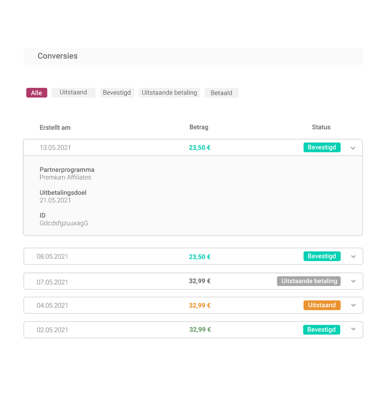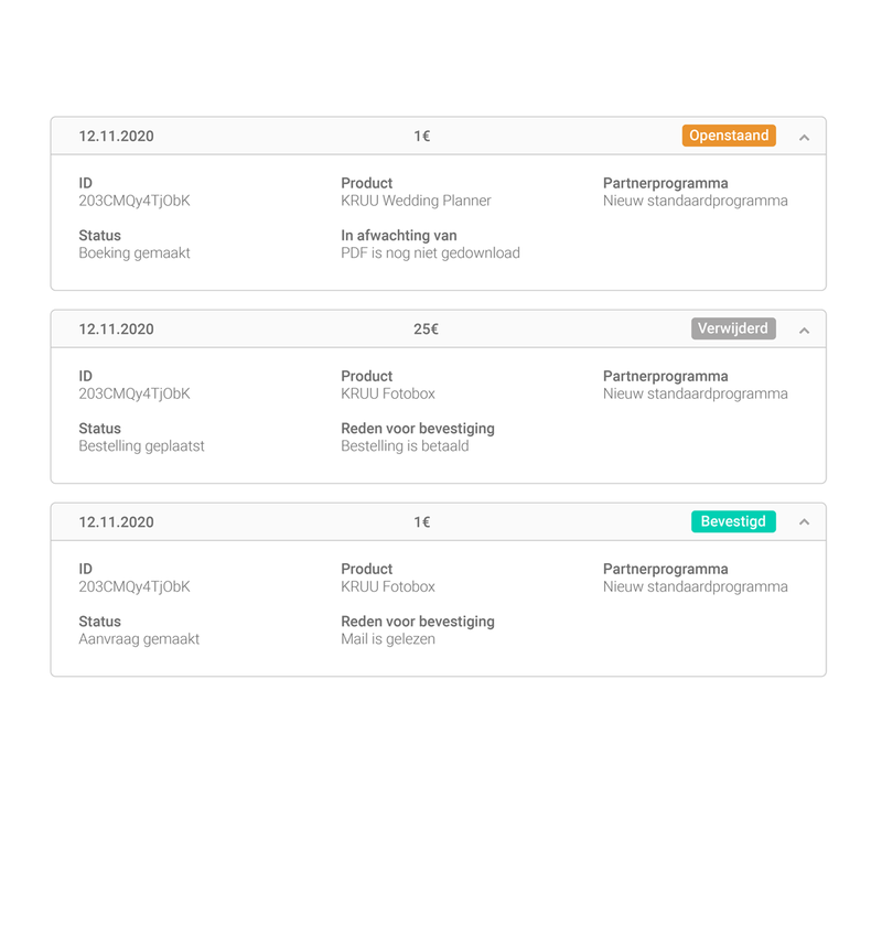 Hieronder hebben we enkele screenshots van de achterkant van ons partnerdashboard in naast elkaar gezet. Wij hechten veel belang aan transparantie, intuïtie en automatisering.